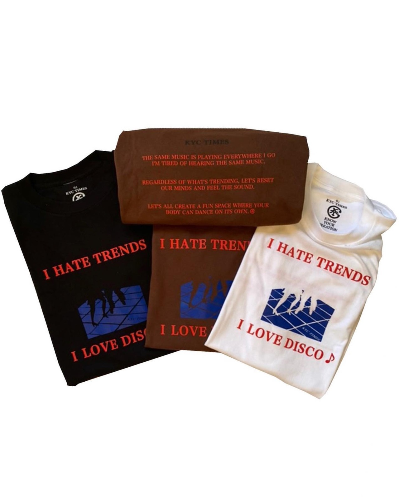 前面には『I HATE TRENDS I LOVE DISCO ♪』 と書かれており背面にはメッセージが書かれています。
